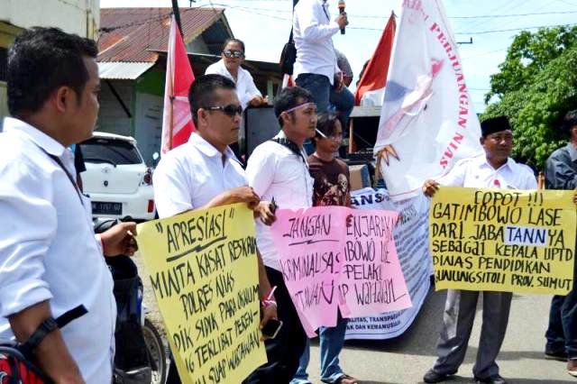 “Kita minta kepada instansi terkait agar segera mencopot GL sebagai Kacabdisdik Gunungsitoli,” kata Tian dalam orasi aksi unjuk rasa yang disertai puluhan aktivis dan insan Pers itu.