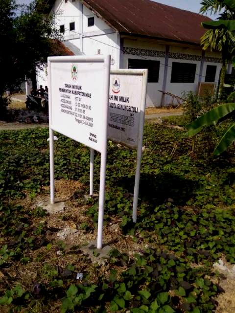 Plang itu bertuliskan “Tanah Ini Milik Pemerintah Kabupaten Nias” dengan Luas 557 meter persegi dengan Kode Lokasi: 12.23.10.06.01.93, dan Kode Barang 01.11.05.05. Nomor Sertifikat: 02110104400016 Tanggal 25 Juli 2007.